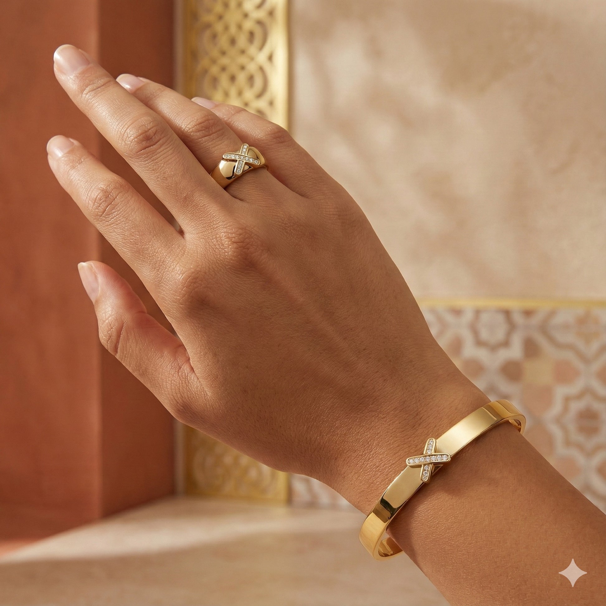 1. سوار عريض (Bangle): يلتف حول المعصم بتصميم انسيابي، يتوسطه شعار X البراق.