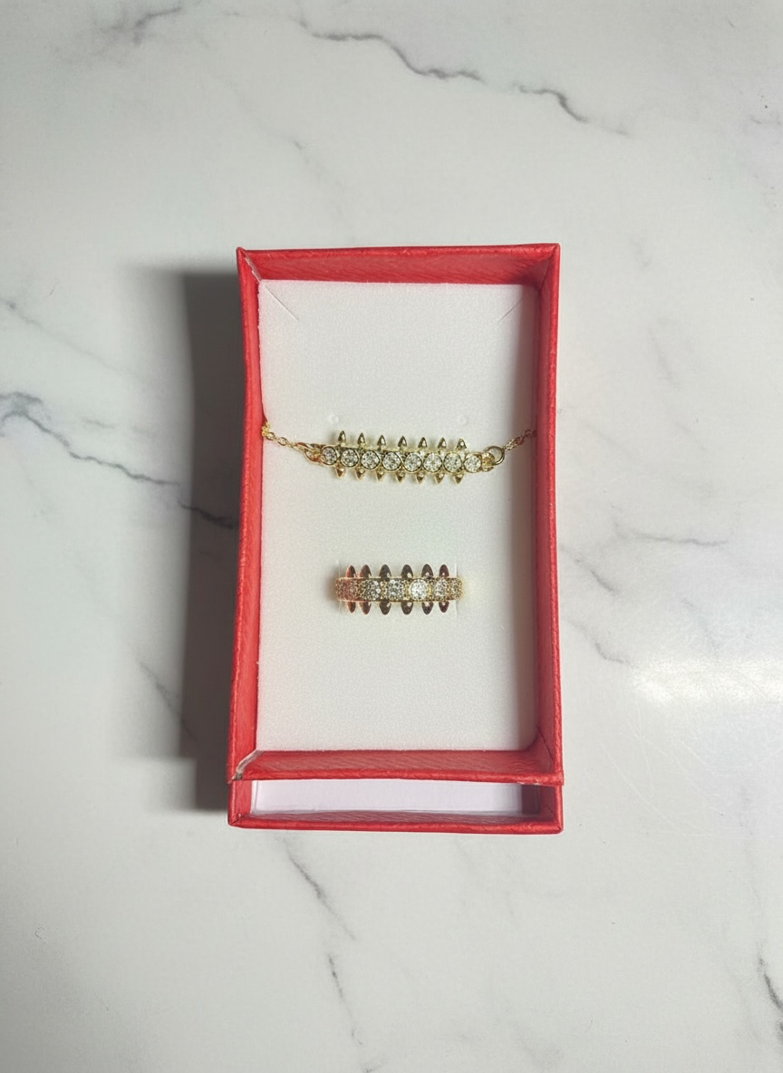 تصميم ثوري يجمع بين المتناقضات: تفاصيل هندسية حادة (أشواك هرمية) مع لمسة ذهبية ناعمة ومرصعة.